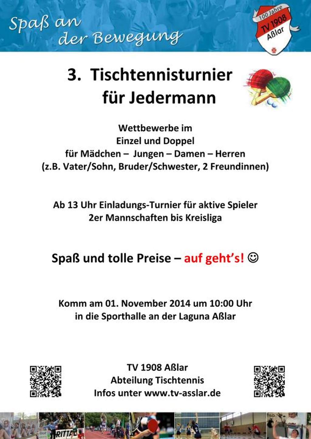 In Anlehnung an die bereits seit zwei Jahren durchgeführten Jedermannturniere veranstaltete die Tischtennis-Abteilung in diesem Jahr ihr drittes Tischtennis Jedermann-Turnier. Eingeladen waren alle interessierten Aßlarer, die sich in der Kunst des Tischtennis versuchen wollten.